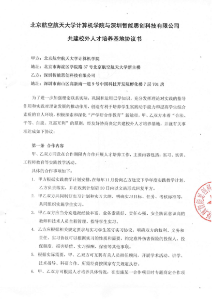 9月13日,智能思創(chuàng)與北京航空航天大學(xué)簽訂了共建校外人才基地協(xié)議。雙方同意在合作期限內(nèi)合作開展人才培養(yǎng)工作,主要內(nèi)容包括∶實(shí)習(xí)、實(shí)訓(xùn)、工程師教育等實(shí)踐教學(xué)活動(dòng),積極探索和深化“產(chǎn)學(xué)研合作教育”新途徑。