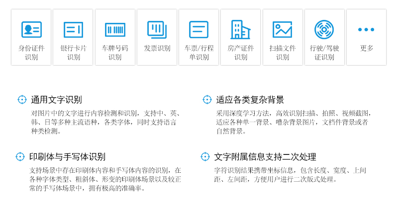 光學(xué)字符識(shí)別(OCR)利用深度學(xué)習(xí)方法,在CNN和RNN的基礎(chǔ)上,研發(fā)改進(jìn)圖片文字識(shí)別的算法體系,并將之應(yīng)用于發(fā)票、行程單、的士票、收據(jù)等各類(lèi)票據(jù),各類(lèi)身份證件,各類(lèi)銀行卡片識(shí)別場(chǎng)景,為領(lǐng)域業(yè)務(wù)提供智能化服務(wù)。