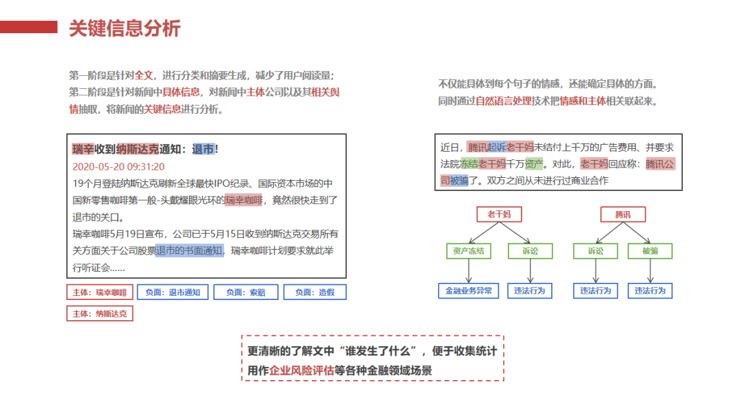 關(guān)鍵信息分析:識(shí)別新聞中的主體公司、風(fēng)險(xiǎn)事件和負(fù)面信息,并進(jìn)行詳細(xì)分類,例如金融業(yè)務(wù)異常、企業(yè)運(yùn)轉(zhuǎn)異常、企業(yè)重大變革等。
